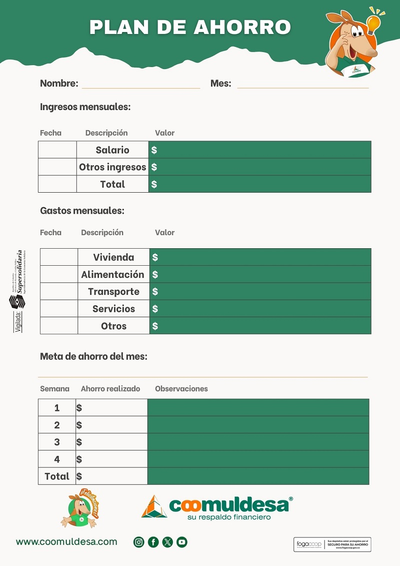 Con el propósito de acompañarle en este camino, hemos diseñado plantillas de ahorro mensual sencillas y prácticas, pensadas en facilitar la organización de sus ingresos, el control de sus gastos, la definición de metas claras y el seguimiento de su progreso, con estas herramientas usted puede adaptarse a su realidad financiera y puede utilizarla de manera física o digital, según su preferencia.
