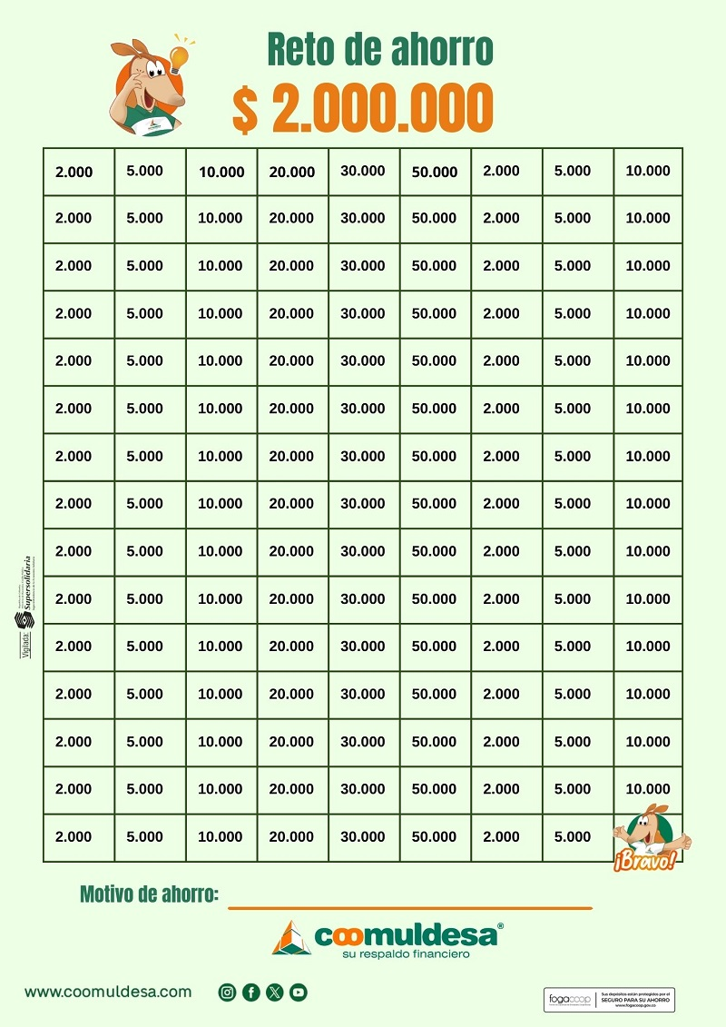 Le invitamos a asumir el reto de ahorrar $2.000.000. Dividir la meta en pequeños pasos facilita el proceso y fortalece el hábito del ahorro. Puede registrar cada semana o cada mes el valor ahorrado y llevar el acumulado hasta completar el objetivo. Este reto puede destinarlo a lo que usted desee.